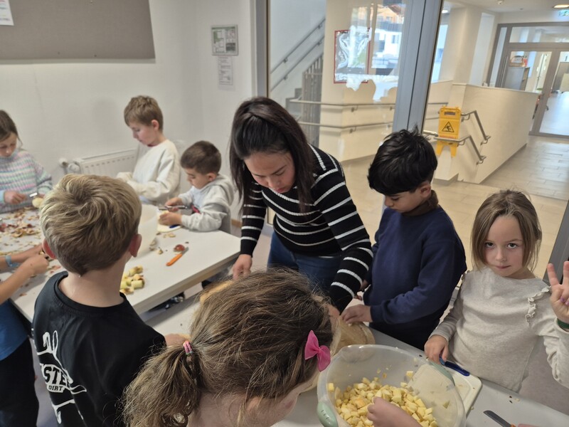 Gemeinsam mit tatkräftiger Unterstützung der Eltern backte die Klasse 1_2 köstlichen Apfelstrudel. Verwendet wurden mitgebrachte Äpfel und Früchte aus unserem Schulgarten. Die Kinder schälten und schnitten die Äpfel fleißig und lernten dabei auch den Weg des Apfels kennen – vom Baum über den Großmarkt und Supermarkt bis nach Hause. Am Ende wurde natürlich gemeinsam gekostet!